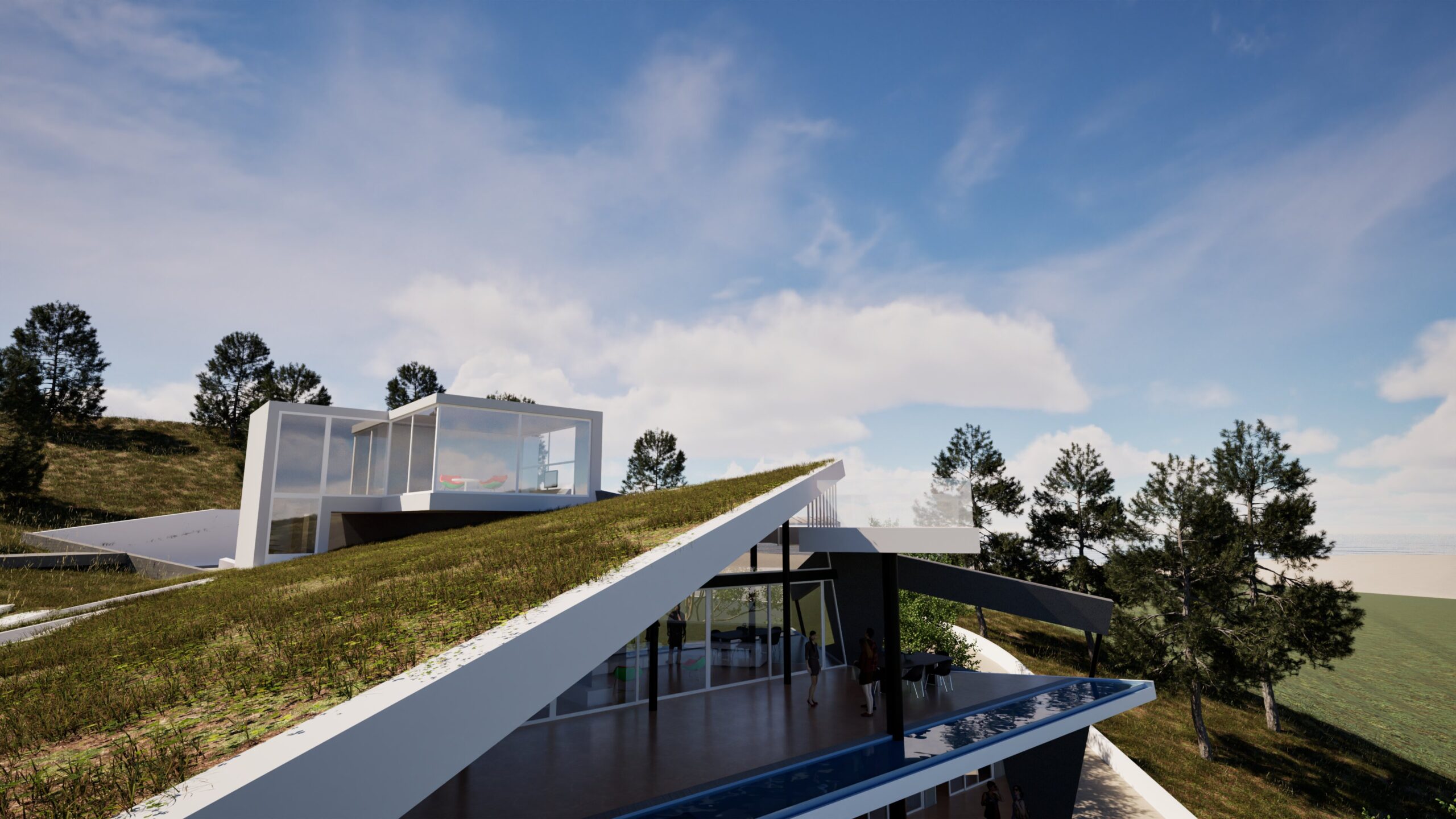 At the lower level, a swimming pool is seamlessly integrated into the design, following the natural contours of the hill. Positioned within one of the carved-out voids, the pool interacts with the surrounding terrain, enhancing the organic feel of the structure. Its reflective water surface mirrors the landscape, further blurring the boundaries between built and natural elements. This feature not only adds to the visual harmony of the house but also provides a tranquil space for relaxation, reinforcing the theme of fluidity and connection with nature.