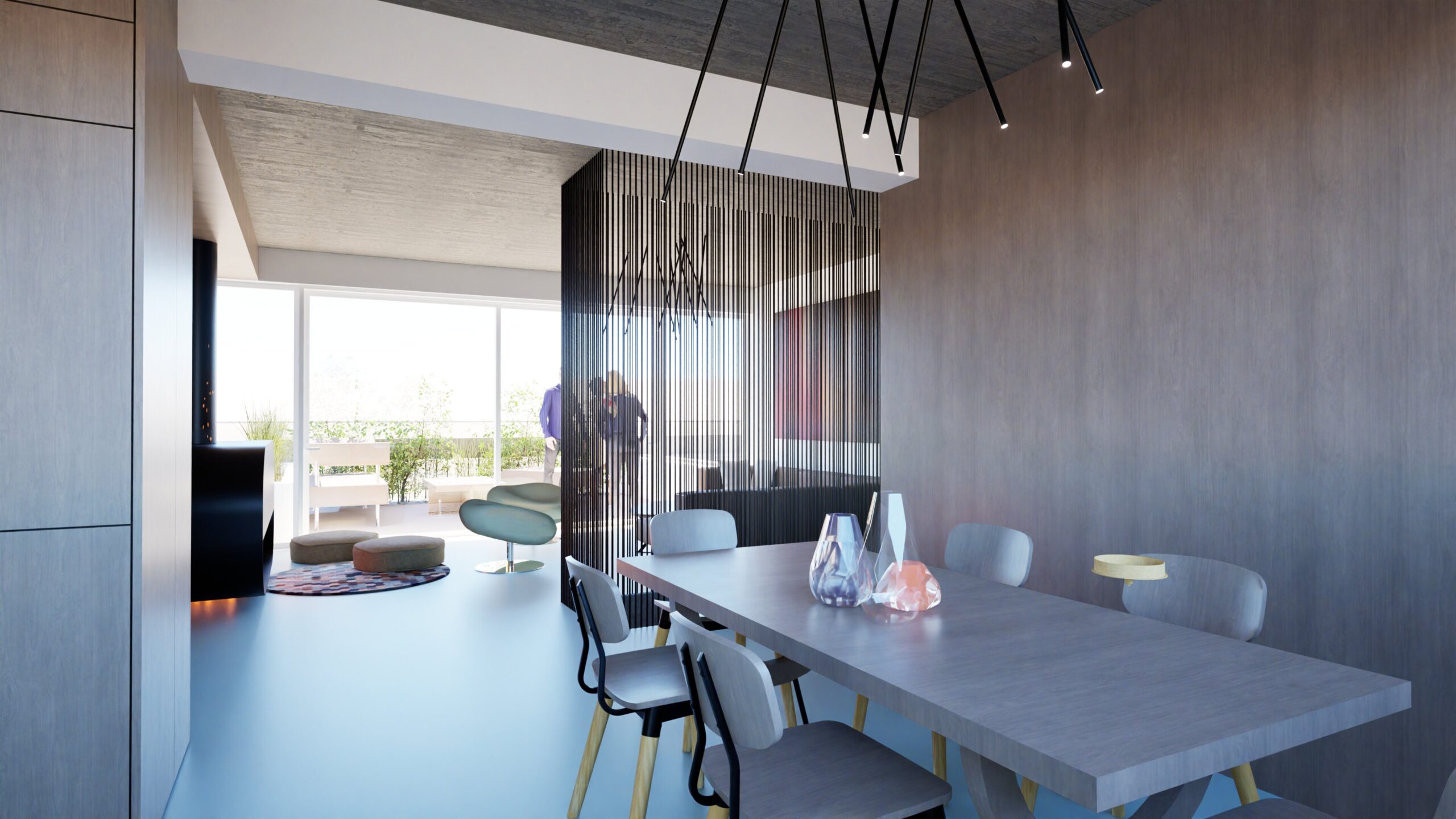 The aesthetic is characterized by a bold use of materials, including exposed concrete and warm-toned terracotta panels, which create a striking textural contrast. A defining feature is the cantilevered concrete ribbon that wraps around the upper floor, providing structural character while acting as a functional shading element for the expansive floor-to-ceiling glass facades. This reflects the firm's holistic approach, which recognizes the deep interconnectedness between planning, design, and construction.