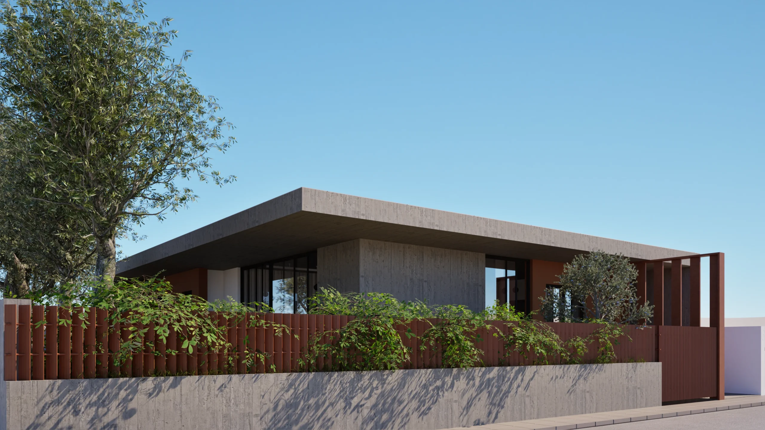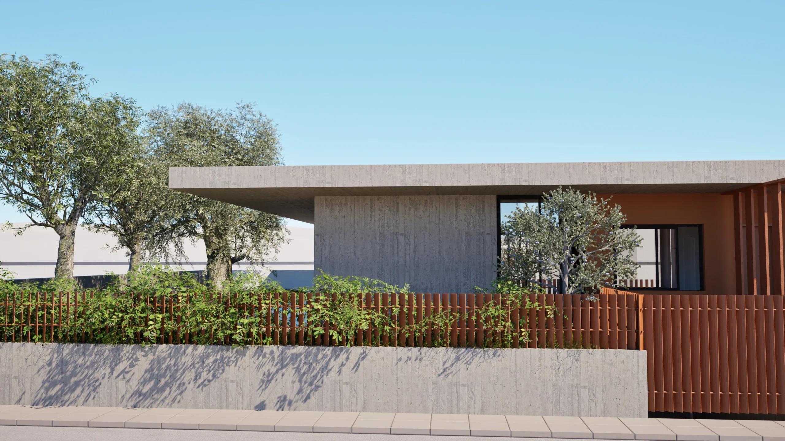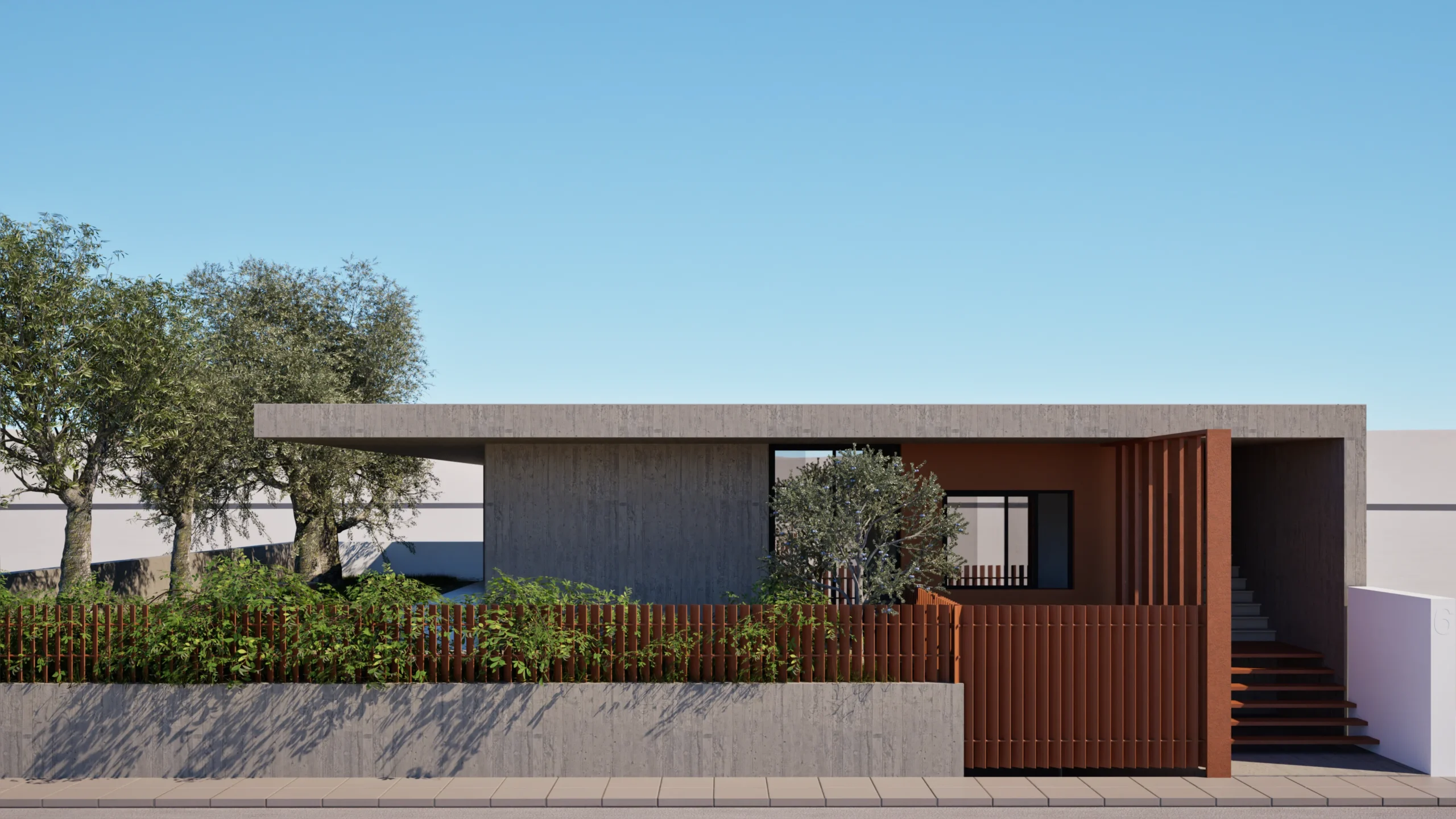 The house is designed to have an immediate connection to the rest of the plot, which likely includes garden or outdoor living areas that seamlessly connect to the home’s large windows and the interior patio. This connection emphasizes a sense of openness, where indoor and outdoor spaces blend together effortlessly. The concrete and stucco materials on the exterior are balanced by natural elements like trees and plants, creating a harmonious relationship between the architecture and its natural surroundings.