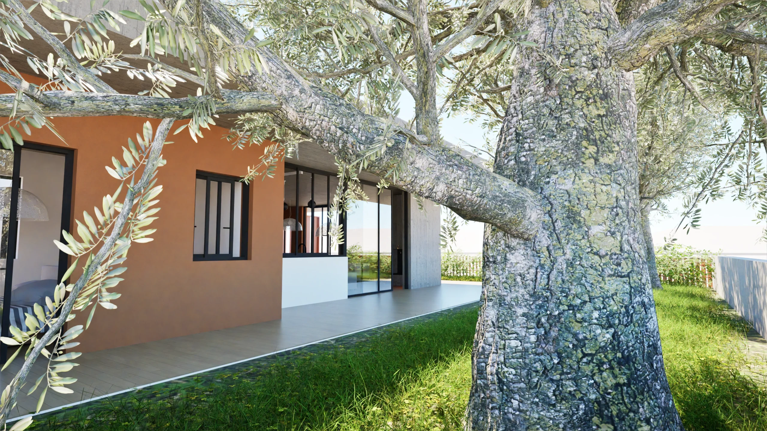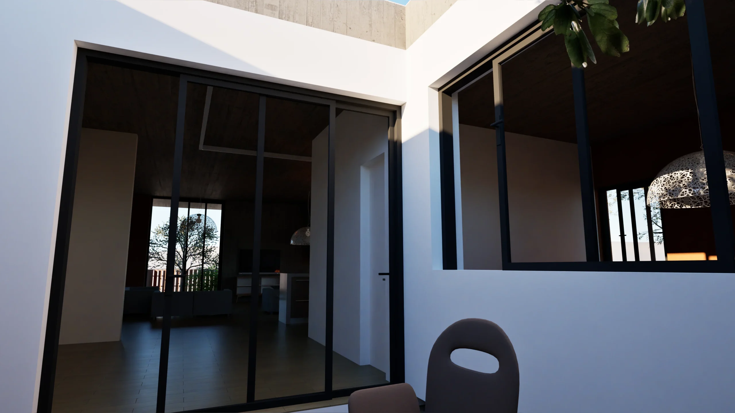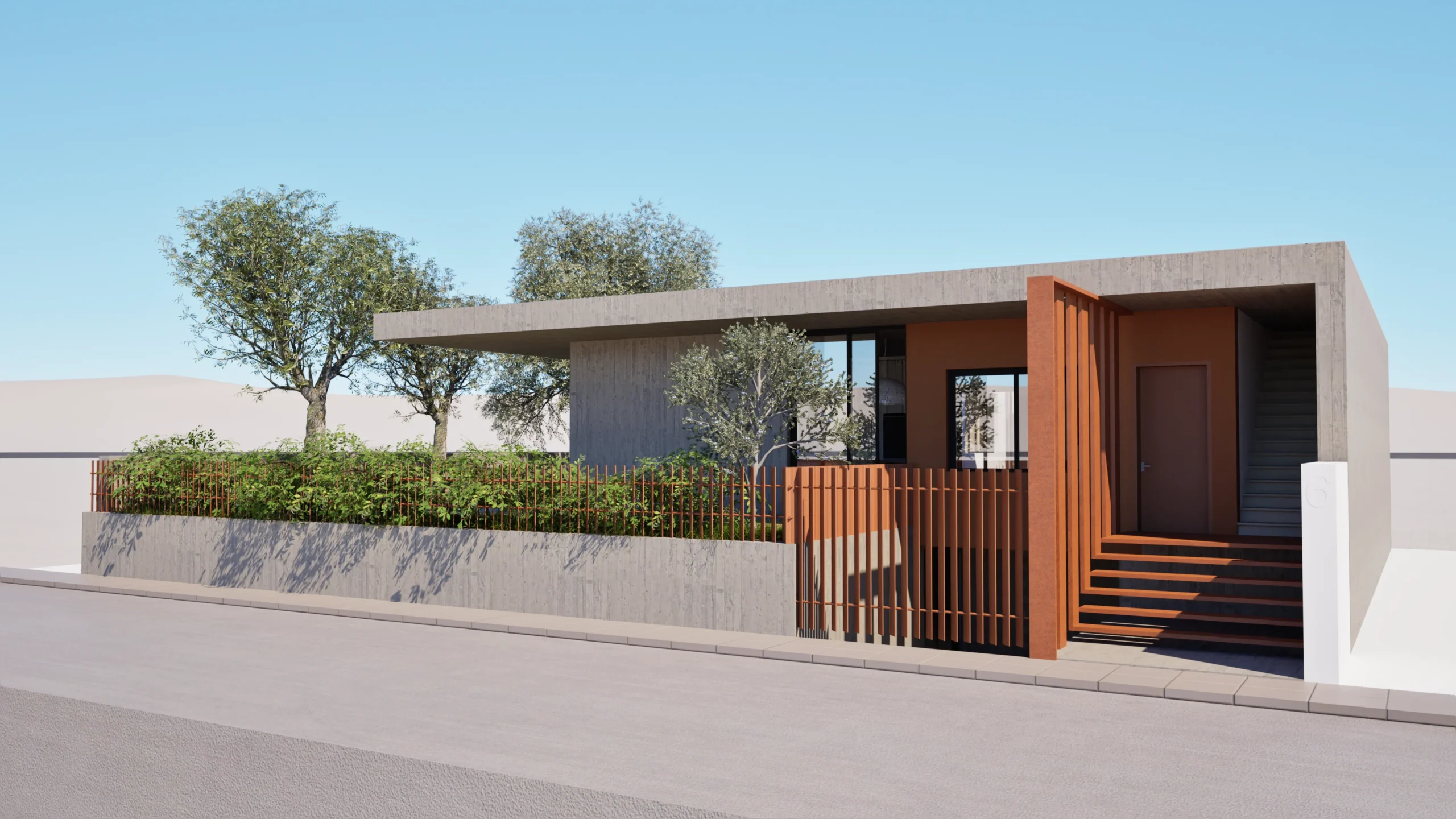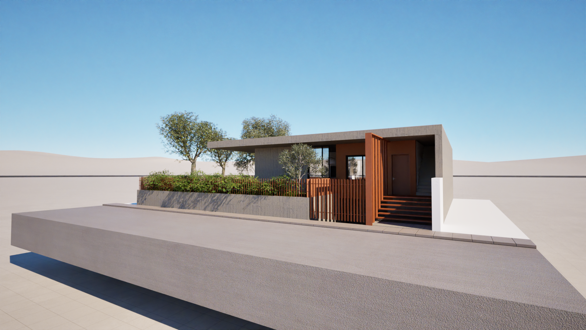 The house is designed to have an immediate connection to the rest of the plot, which likely includes garden or outdoor living areas that seamlessly connect to the home’s large windows and the interior patio. This connection emphasizes a sense of openness, where indoor and outdoor spaces blend together effortlessly. The concrete and stucco materials on the exterior are balanced by natural elements like trees and plants, creating a harmonious relationship between the architecture and its natural surroundings.