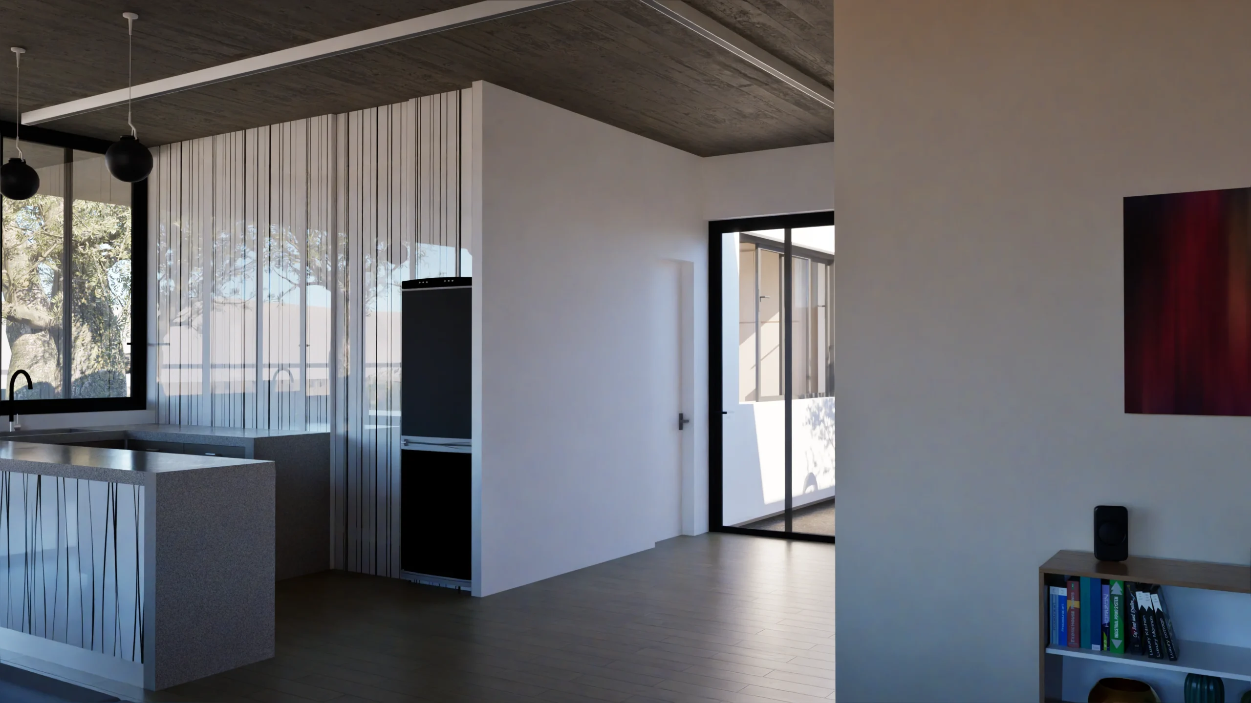 Two Bedrooms: The bedrooms are positioned to maximize privacy and comfort, while still maintaining a connection to the rest of the house through the patio views. Both rooms are likely designed to be spacious and bright, with large windows and simple, clean lines that complement the overall minimalist aesthetic of the home.
