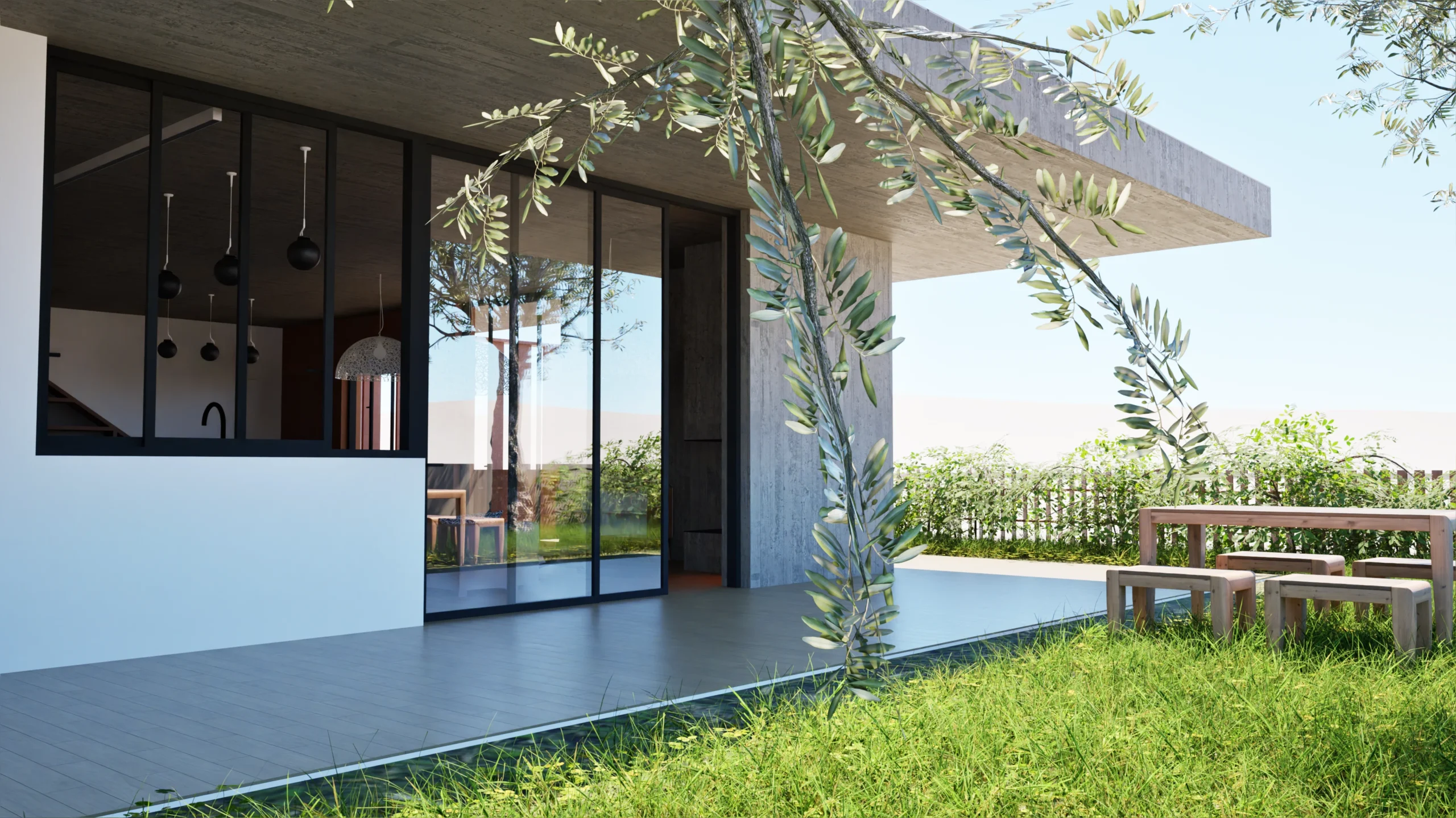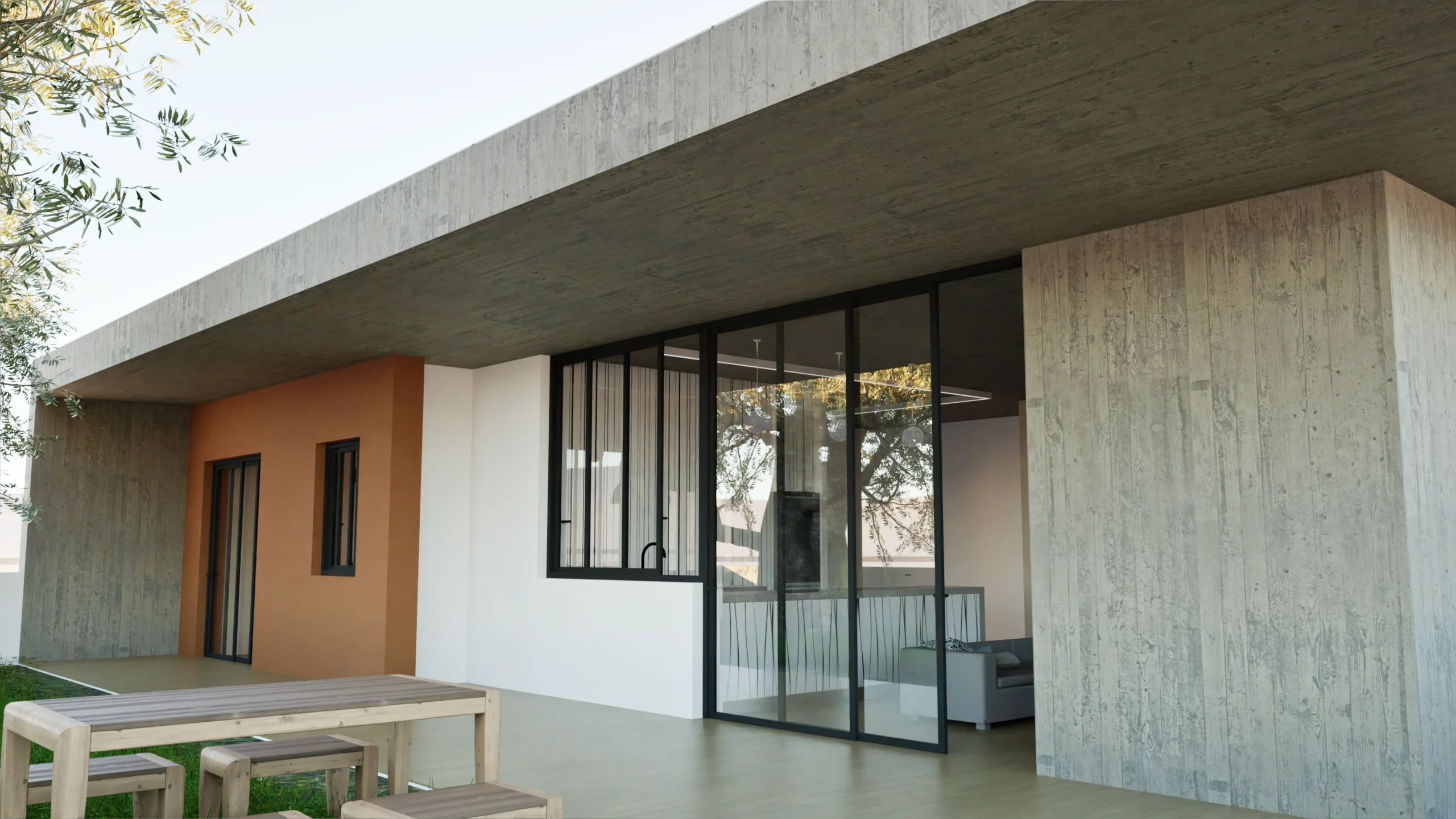 Modern concrete house exterior with a wooden dining set on a lush green lawn, showcasing a seamless indoor-outdoor living space with large glass doors and a minimalist design. By Modify Architects
