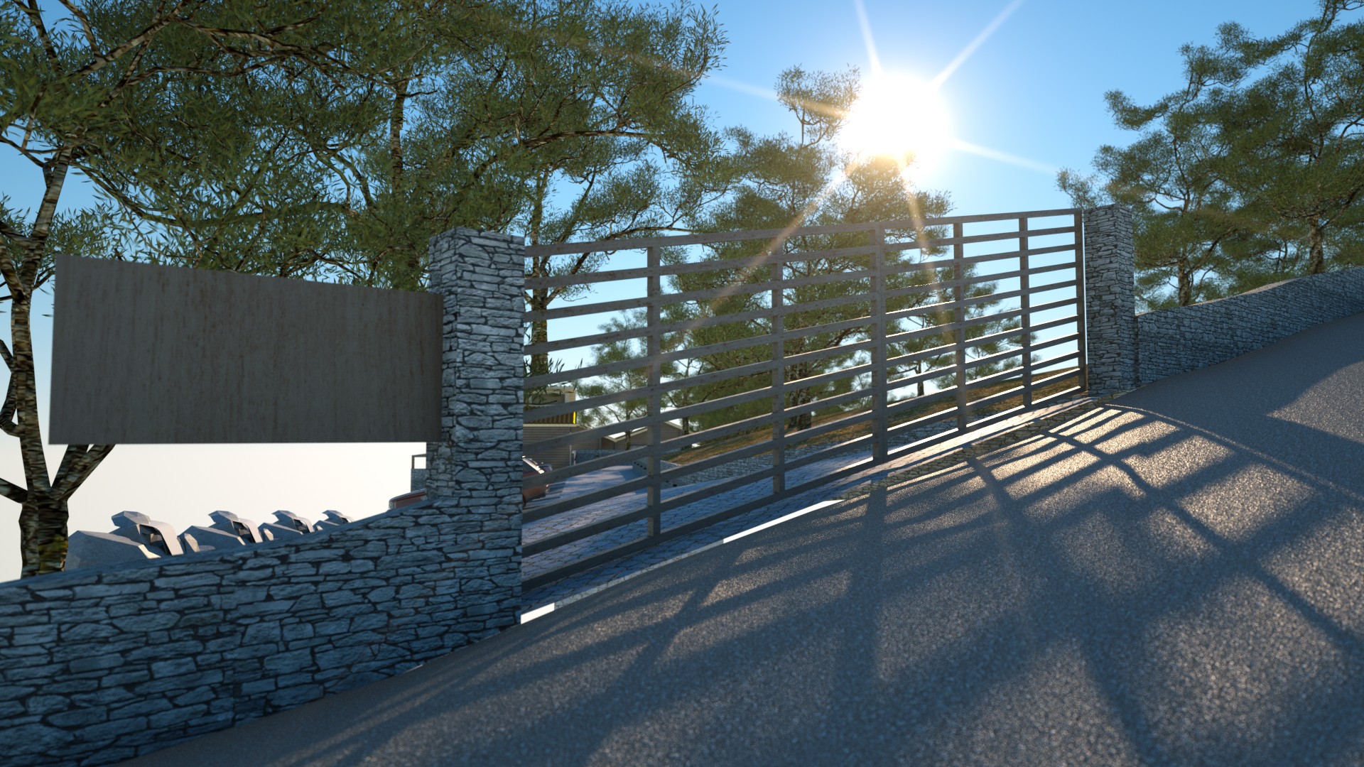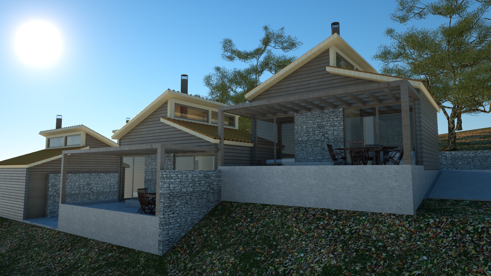 Architectural rendering of a modern house nestled into a hillside in Kalavrita, Greece. The scene features a stone retaining wall, a cobblestone driveway with parked cars, and lush evergreen trees under a bright, sunny sky. The house has wooden siding and a terracotta tile roof, blending seamlessly with the natural landscape. By Modify Architects