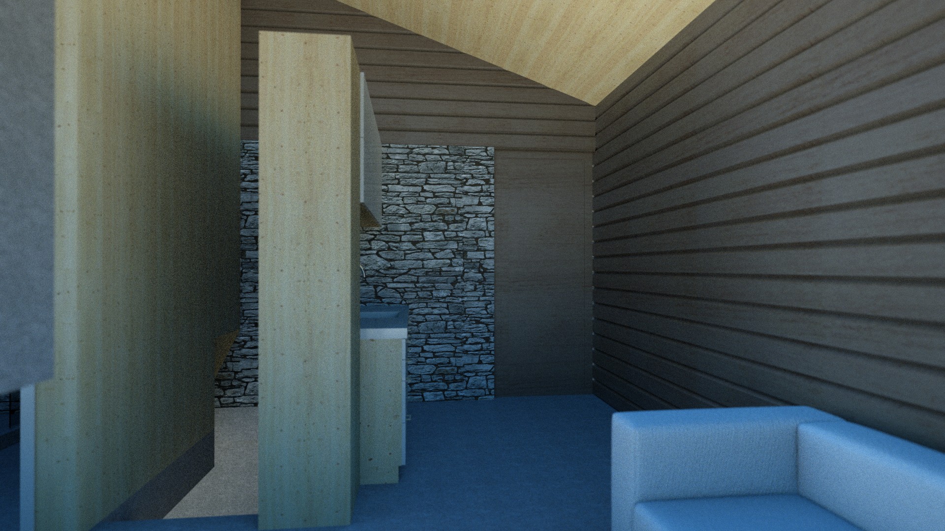 Architectural rendering of a covered outdoor dining area with a wooden pergola, stone columns, and a table with chairs, showcasing a blend of rustic and modern design elements. By Modify Architects