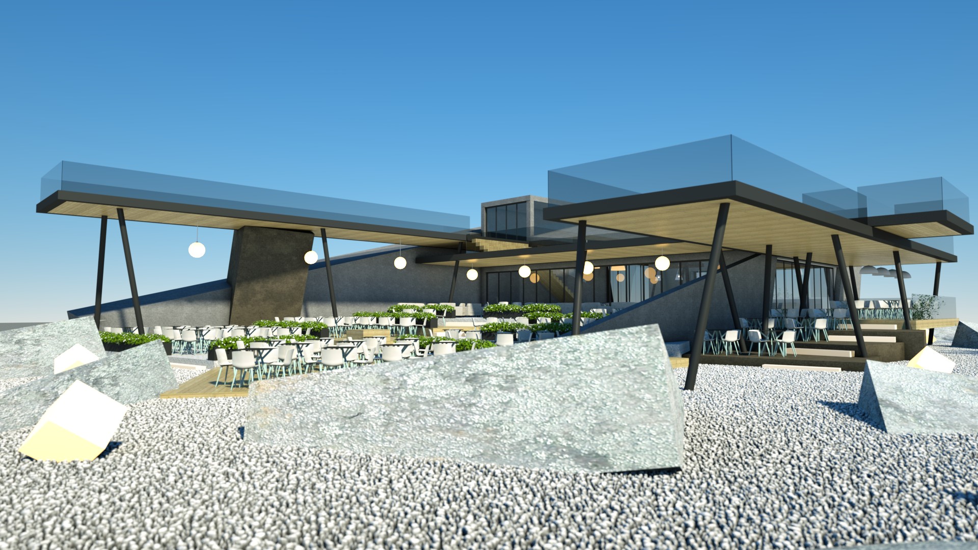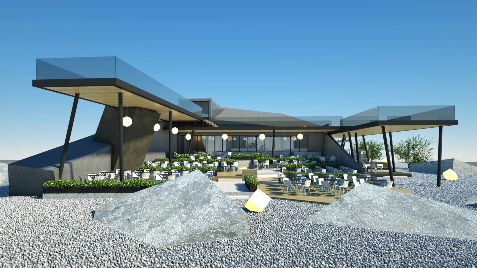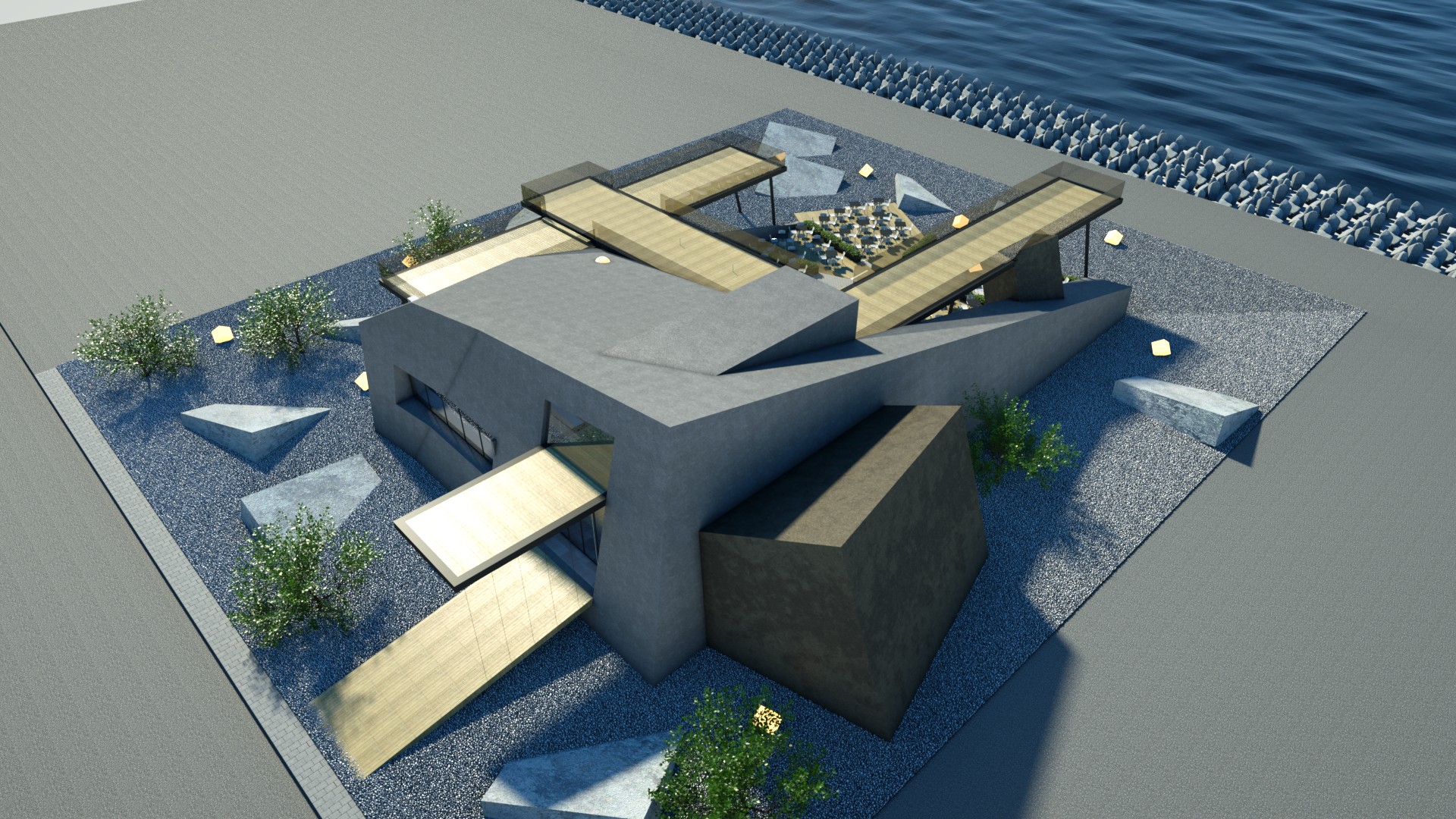 Designing a café-restaurant with a concept that features concrete blocks stacked on each other, creating usable spaces in between, offers an innovative and visually striking approach. This design not only reflects the wave crusher concept but also optimizes the functionality and aesthetics of the space.