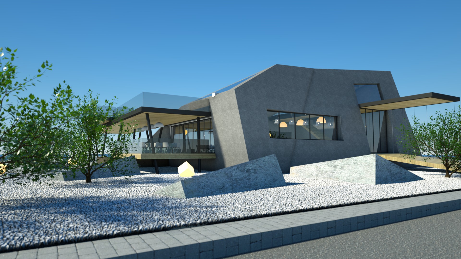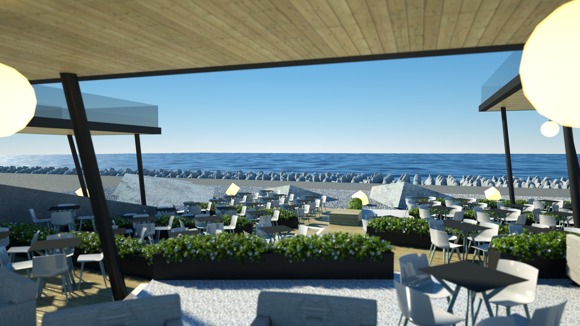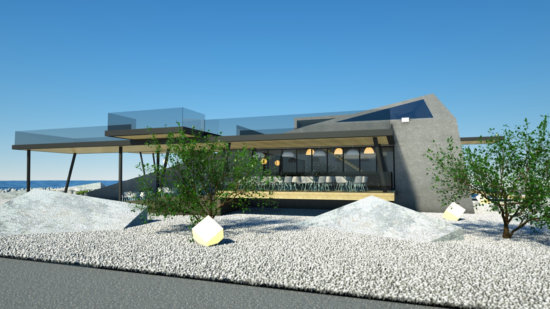 Designing a café-restaurant with a concept that features concrete blocks stacked on each other, creating usable spaces in between, offers an innovative and visually striking approach. This design not only reflects the wave crusher concept but also optimizes the functionality and aesthetics of the space.
