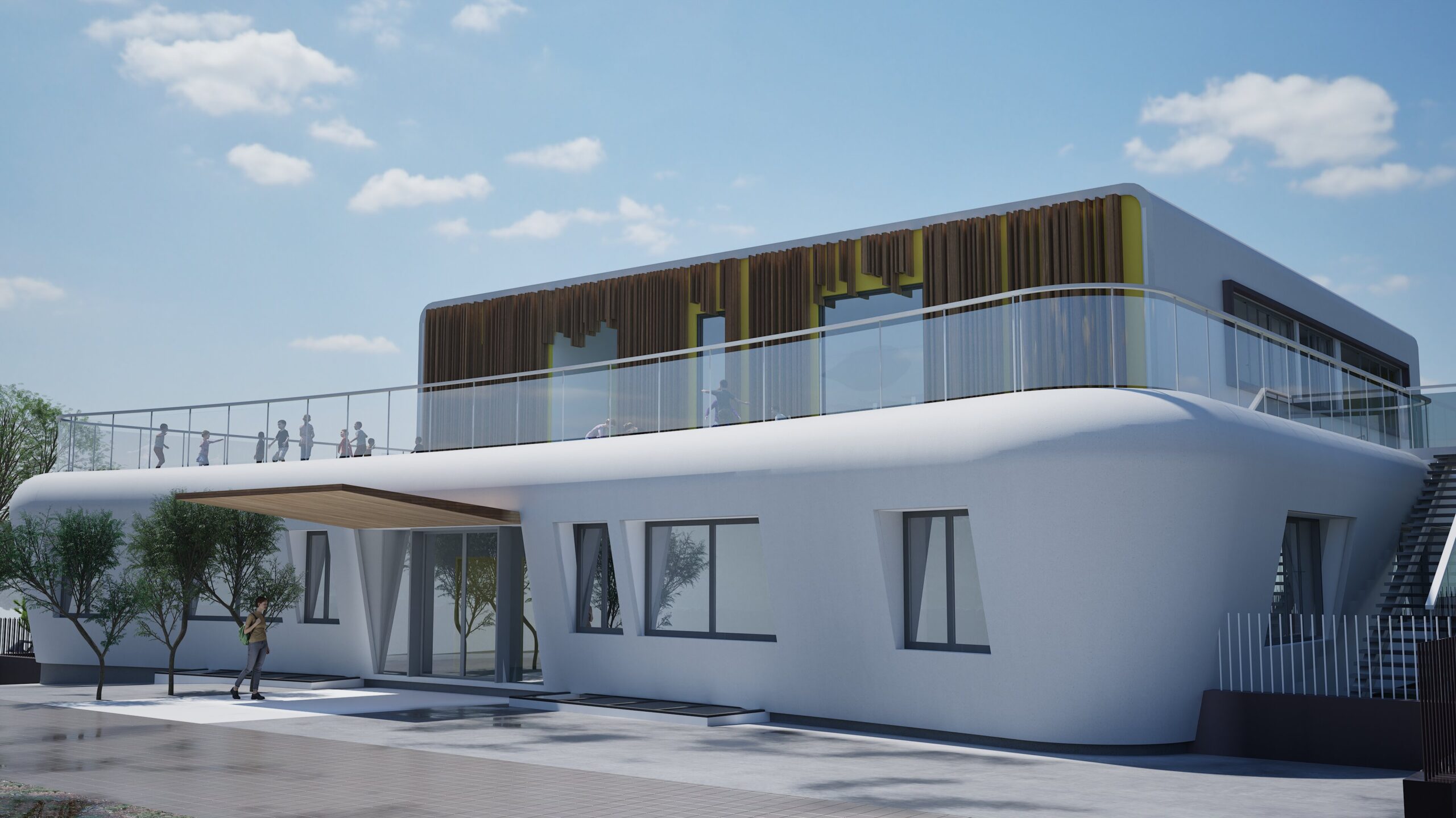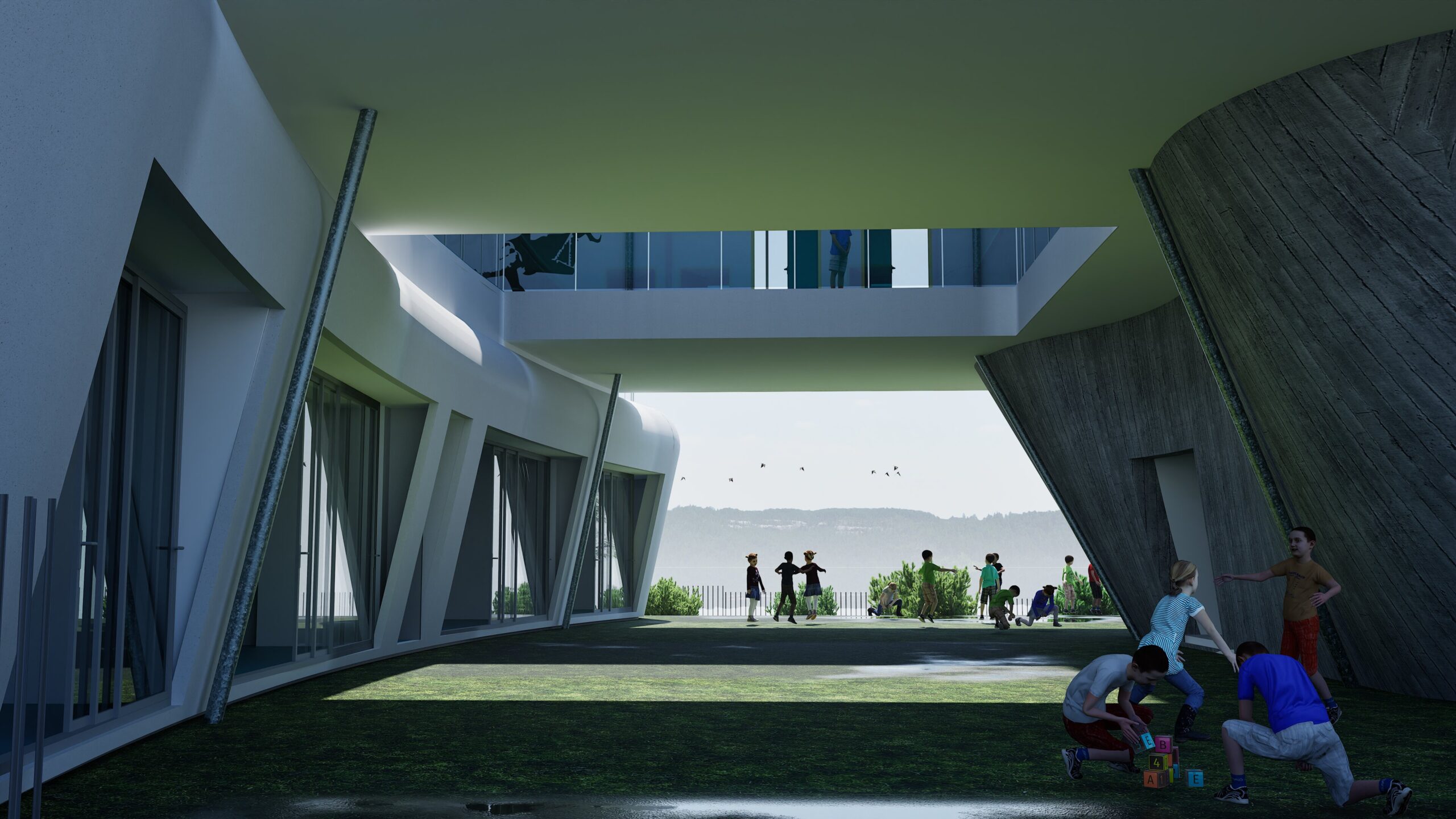 This innovative project is a bold architectural solution that merges educational and recreational facilities within a single, multifunctional complex. Spanning three distinct levels — a basement pool, a kindergarten on the ground floor, and a primary school on the first floor — the building is designed to foster holistic child development in an environment that is as functional as it is aesthetically engaging. The structure emphasizes sustainable design, safety, and the creation of dynamic spaces for learning and play.