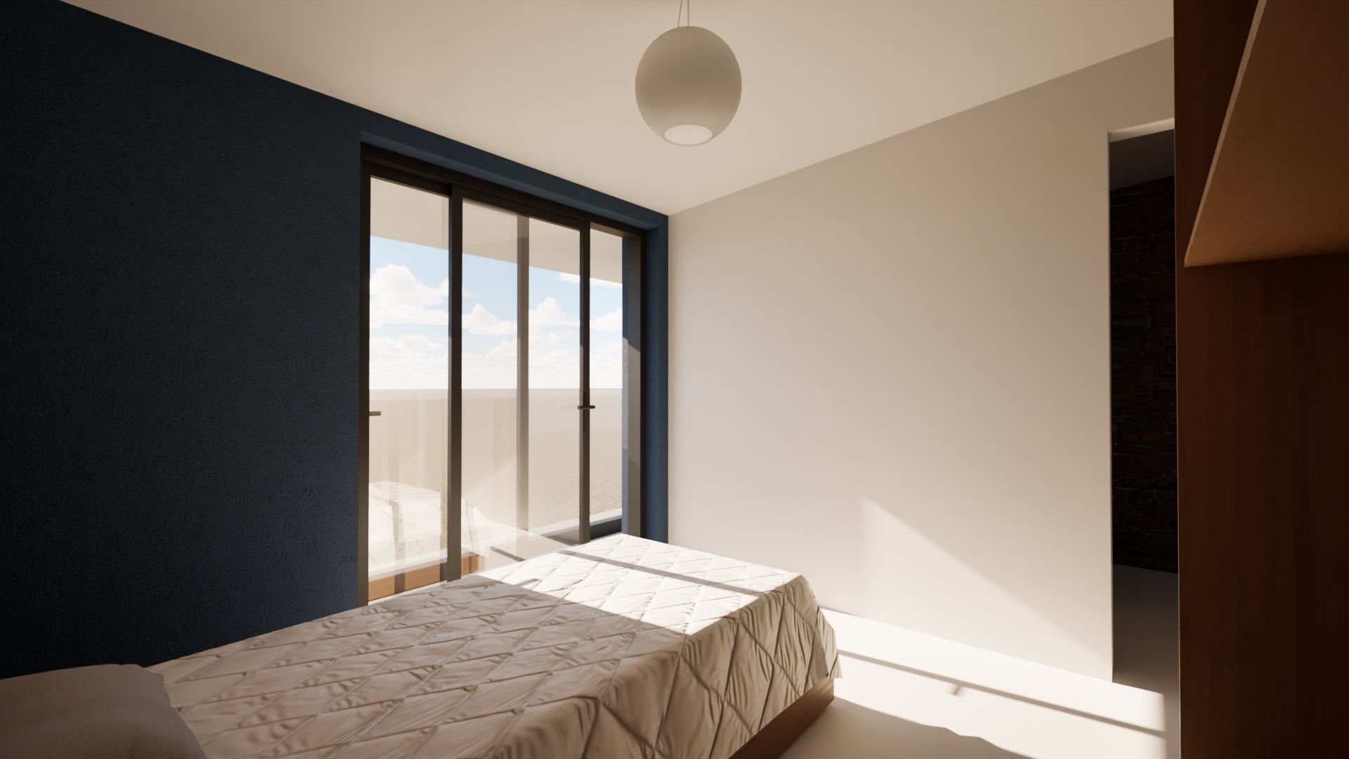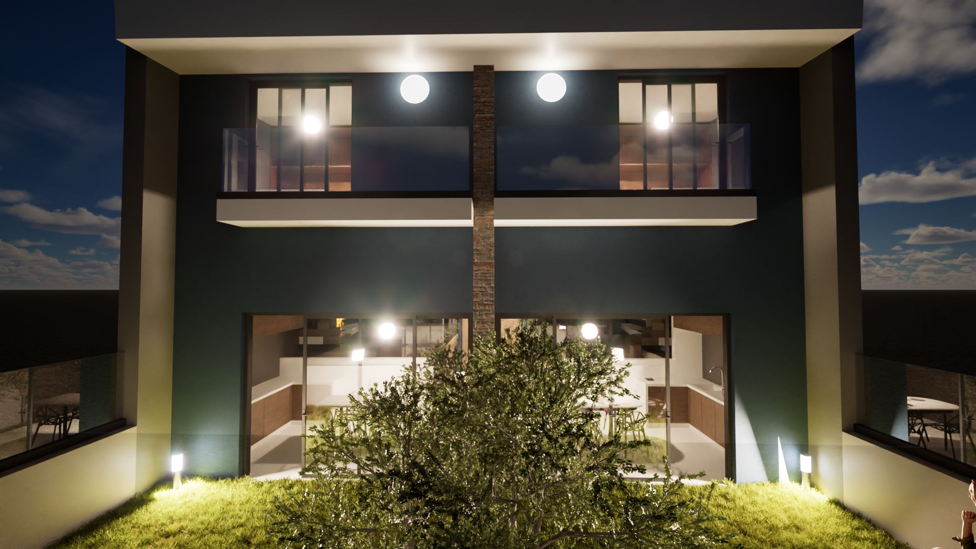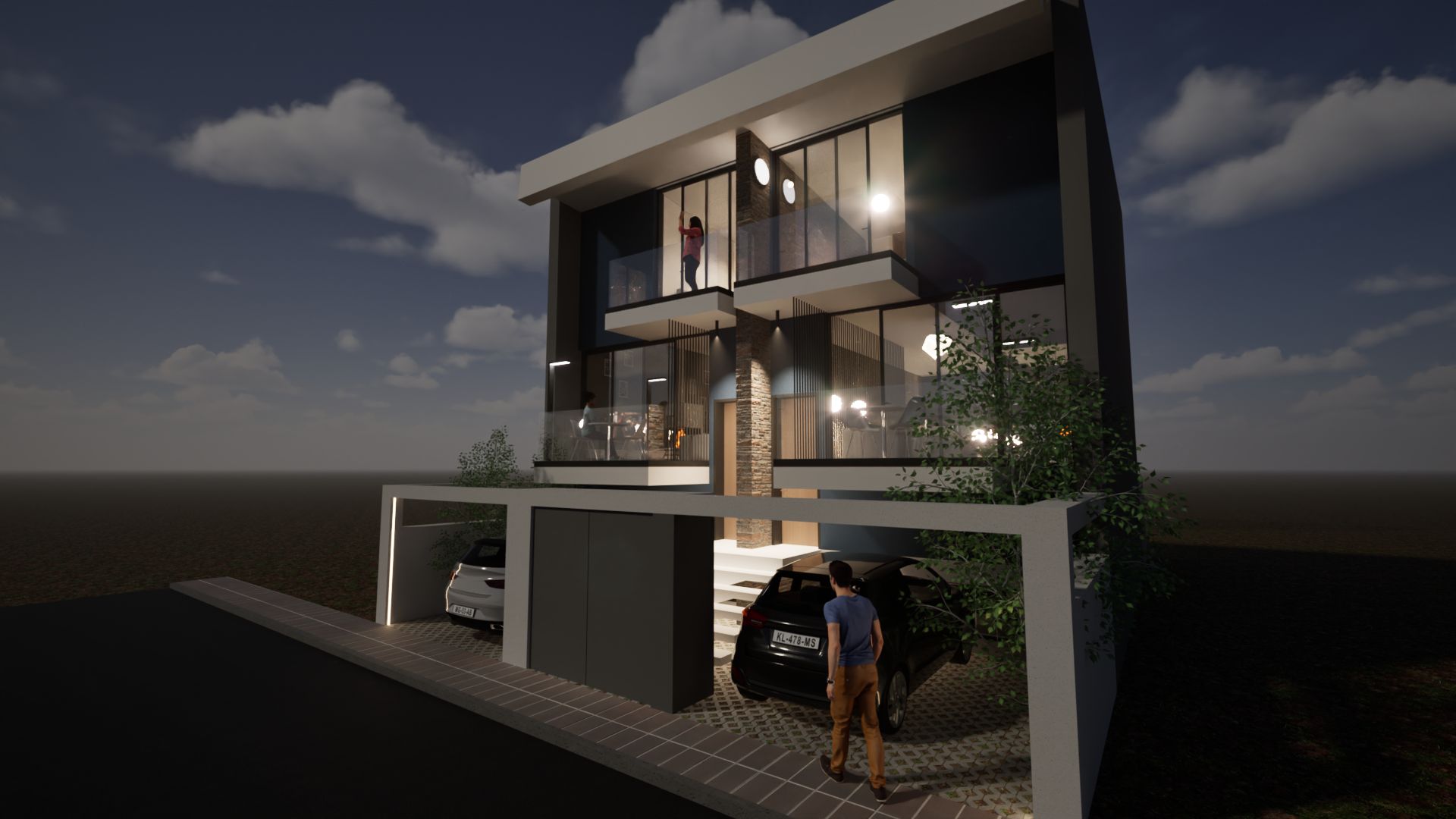 Modern interior architectural rendering of a walkway with a textured wall, dark metal railings, and a person walking towards a bright outdoor view with trees and illuminated spheres hanging from the ceiling. By Modify Architects