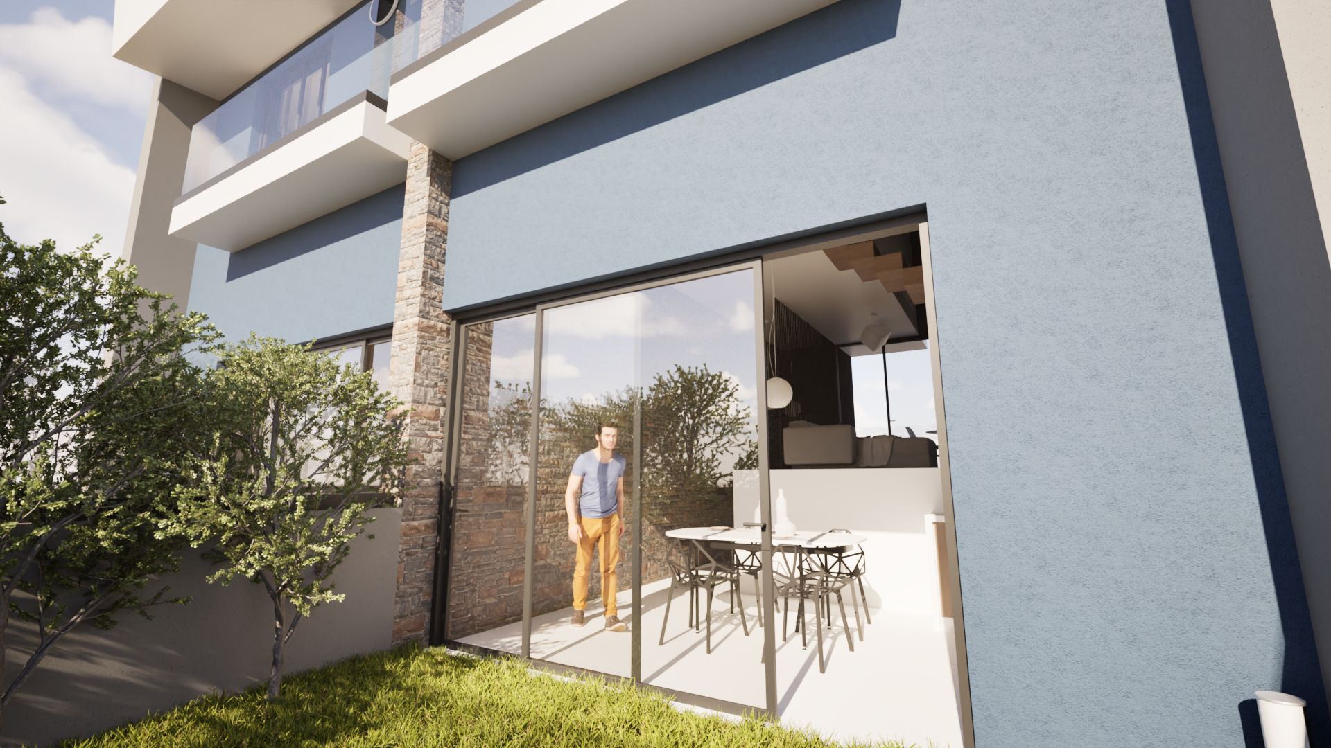 A high-angle architectural rendering showcases a modern kitchen and dining area seamlessly connected to an outdoor patio. The kitchen features light wood cabinetry, stainless steel appliances, and a sleek countertop. A round dining table with black metal chairs sits adjacent to large glass sliding doors that open onto a green patio with outdoor furniture and people relaxing. Exposed brick and a dark blue ceiling add texture and contrast to the space. The overall aesthetic is contemporary and inviting, emphasizing indoor-outdoor living. By Modify Architects