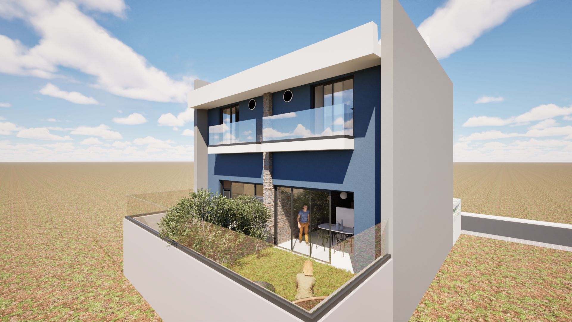 Two Bedrooms: The bedrooms are positioned to maximize privacy and comfort, while still maintaining a connection to the rest of the house through the patio views. Both rooms are likely designed to be spacious and bright, with large windows and simple, clean lines that complement the overall minimalist aesthetic of the home.