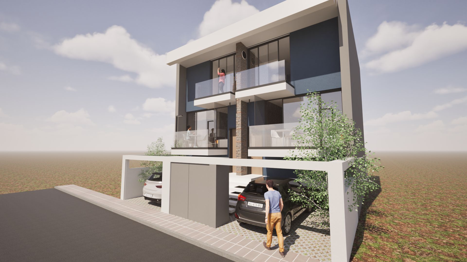 A modern two-story residential building with a white and gray facade, featuring large windows, balconies with railings, and a ground-level garage. People are visible on the balconies and near the entrance, suggesting a lived-in atmosphere. The building is set against a backdrop of a grassy field and a paved driveway. By Modify Architects