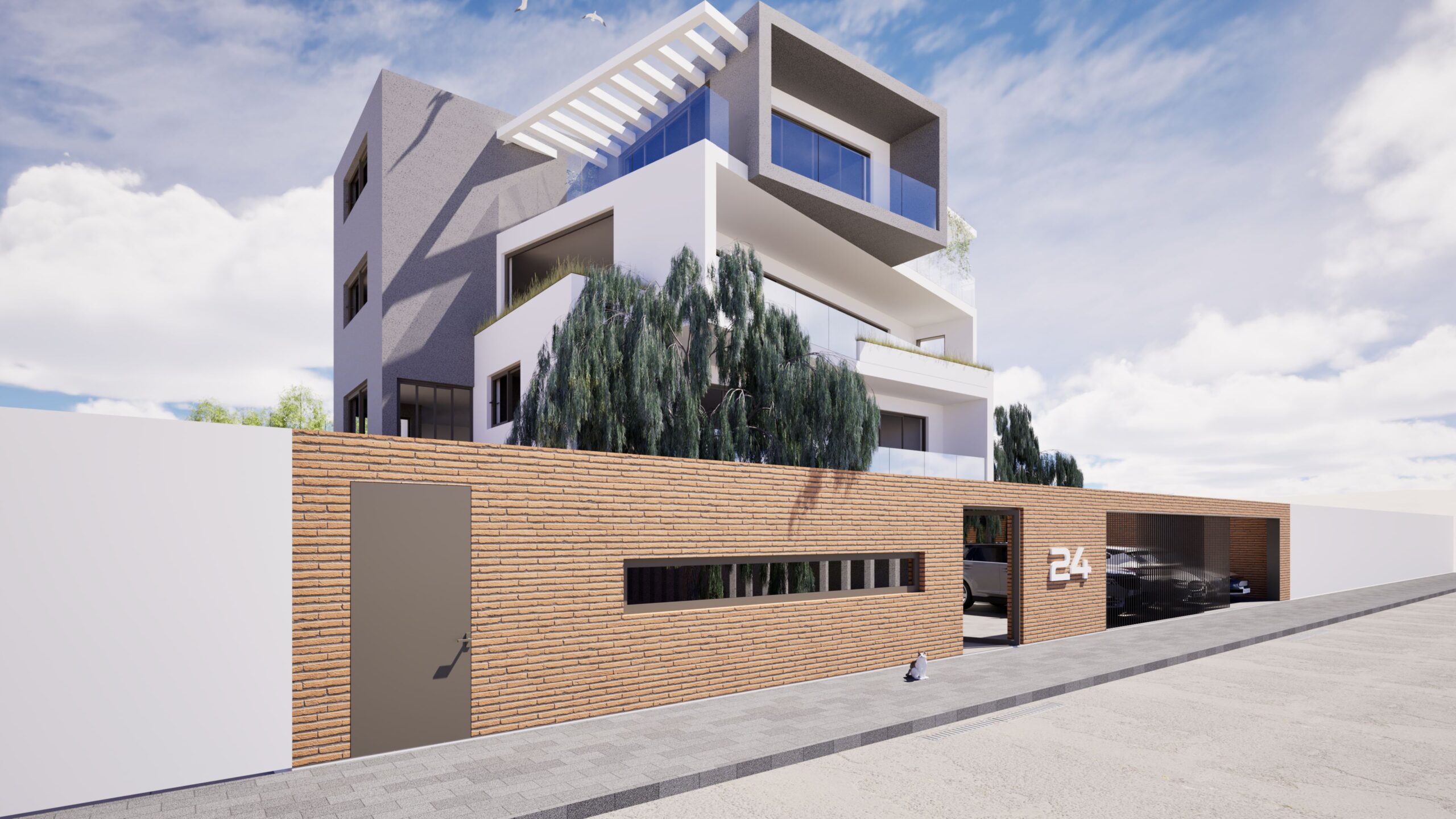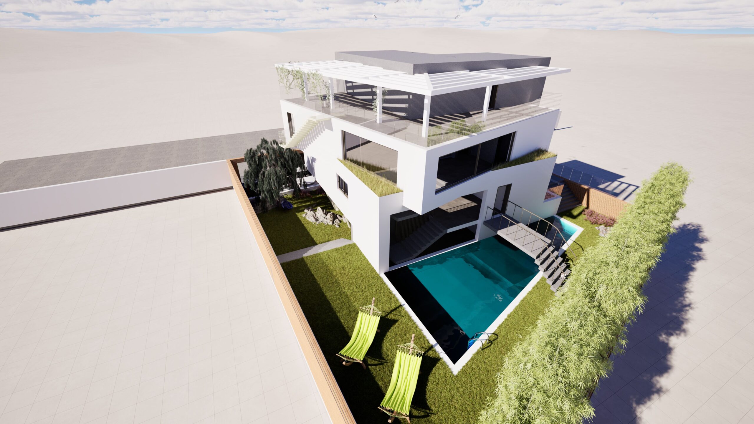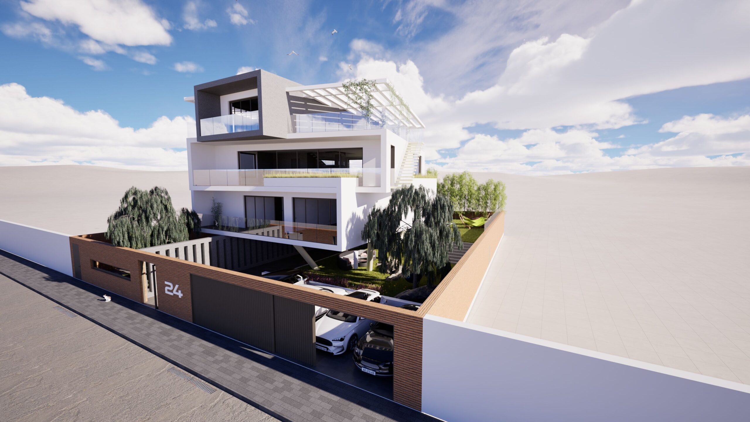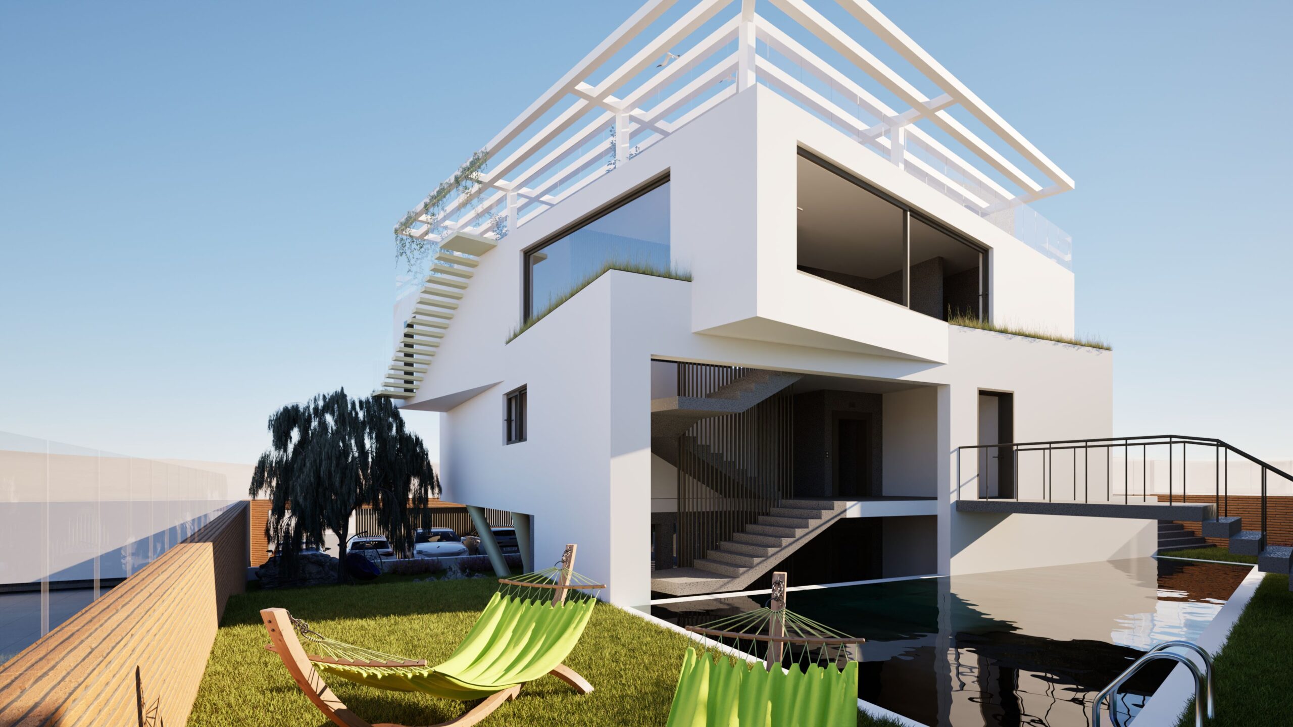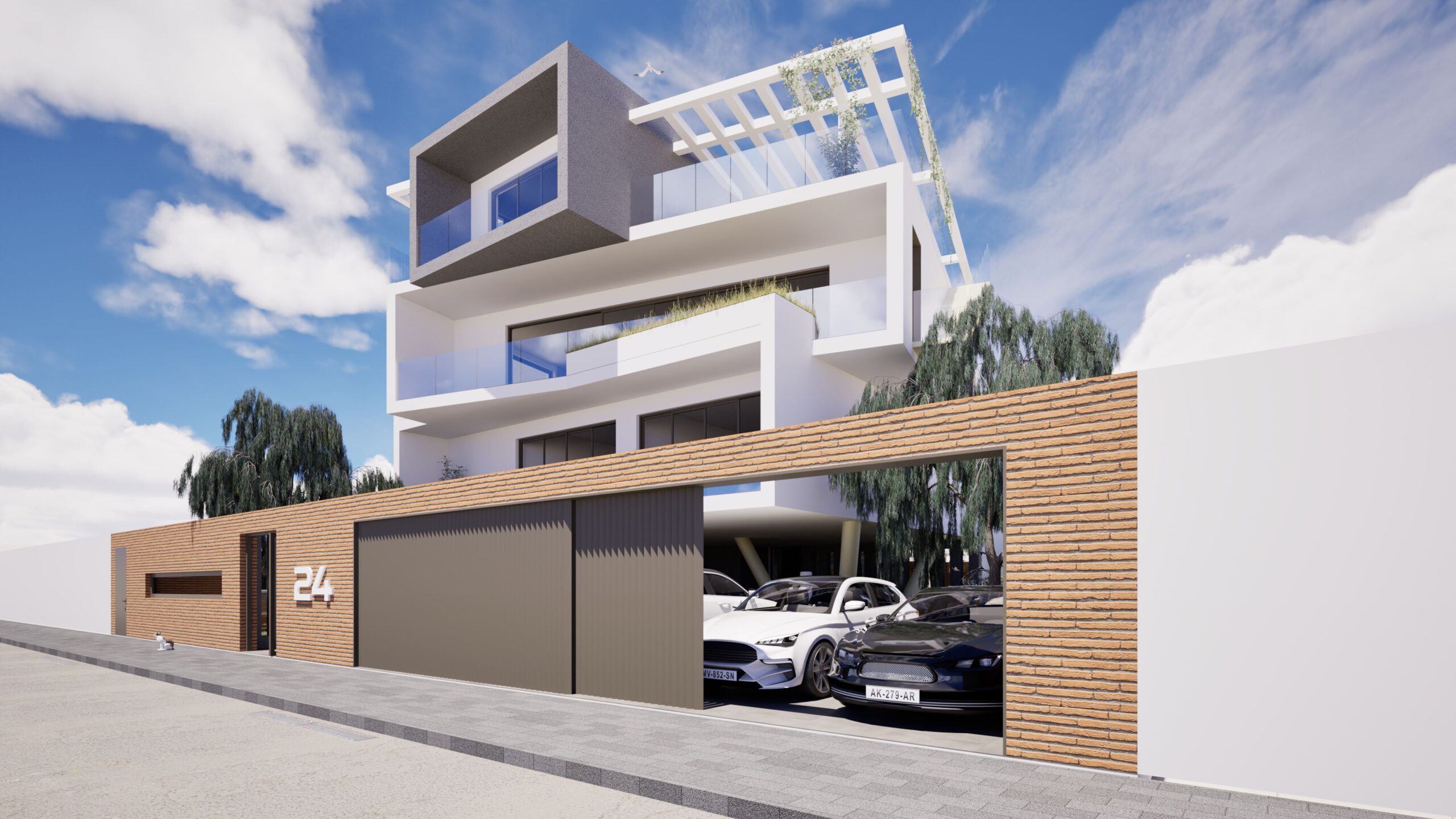 The journey begins at the ground level, where the residence rests on a series of sculptural, angled columns. This open-plan base maintains a light footprint, housing a sheltered car port and a private, self-contained apartment that offers an intimate connection to the landscaped entry. Moving upward, the first floor serves as a serene sleeping wing with three bedrooms. In a unique gesture of connectivity, this level is linked to the backyard’s geometric pool via a suspended pedestrian bridge—a physical extension of the architecture that allows residents to transition from sleep to water in a single, fluid path over the garden.
